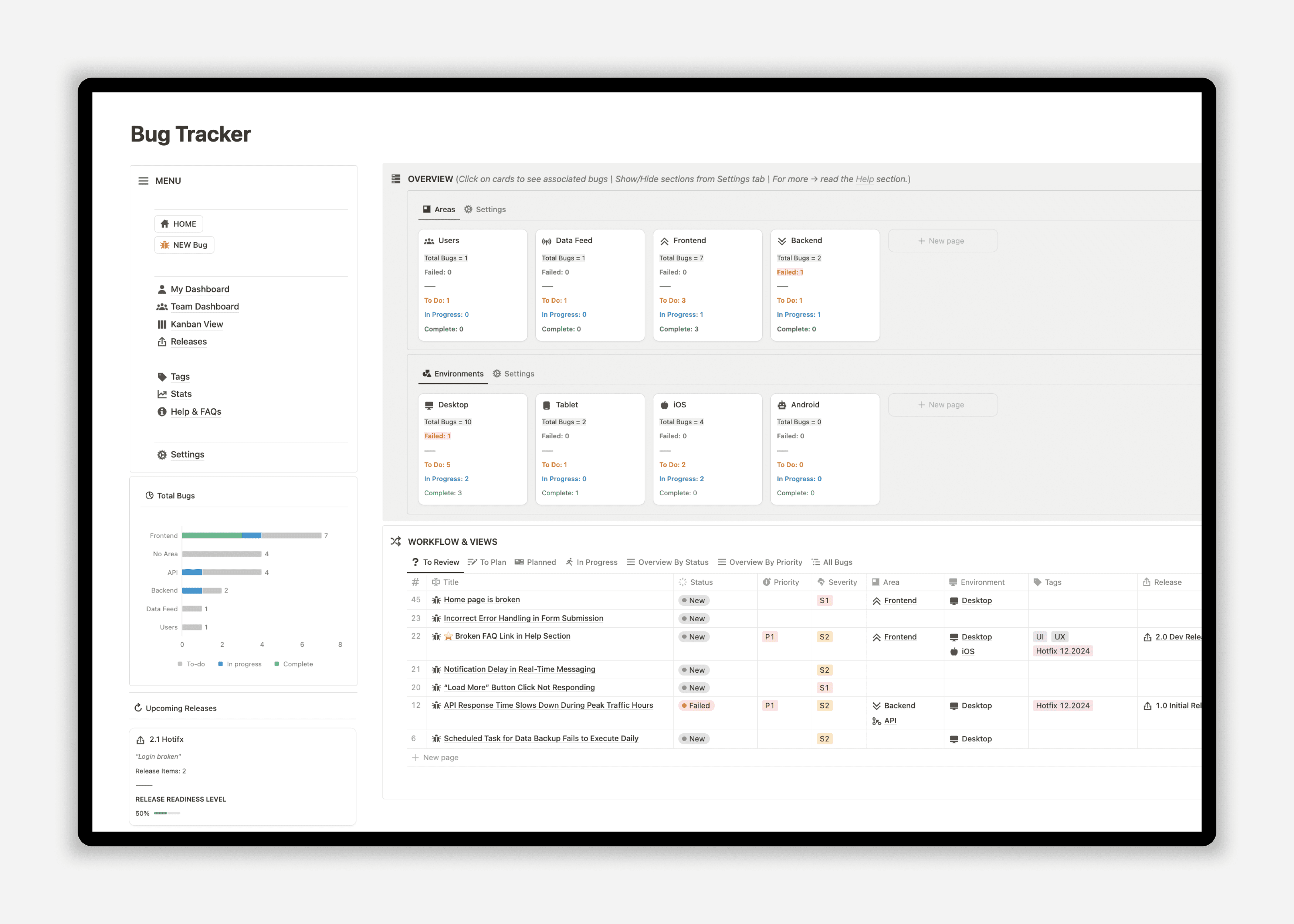 A powerful, customizable Notion template designed to streamline bug management for teams and developers.